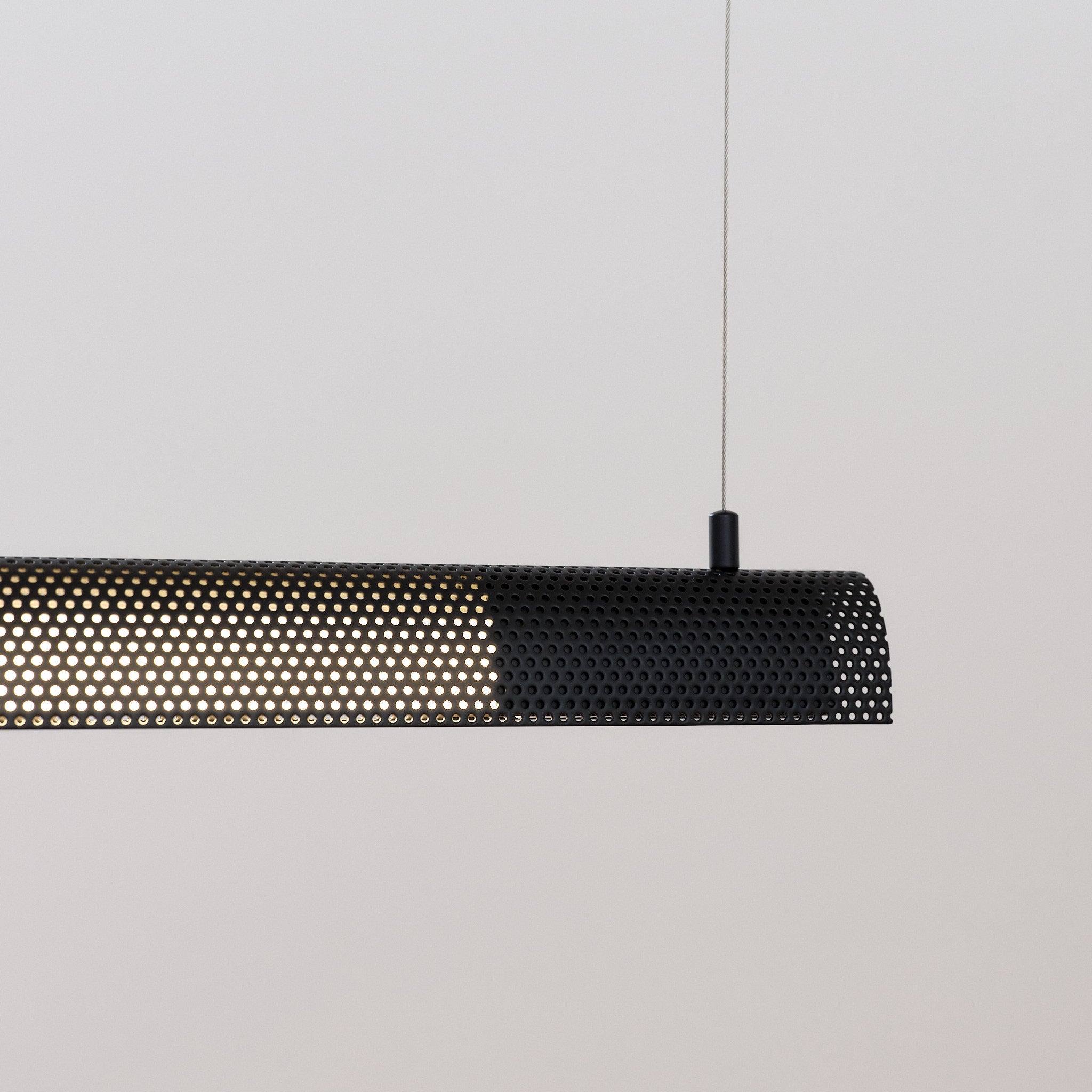 Based on a standard LED light tube Radent Pendant Lamp offers both direct downlight and subtle up light. The perforated metal mesh provides soft lighting. The Radent pendant lamp is available in four variations: black, white, steel or brass finish. And comes in 2 length.