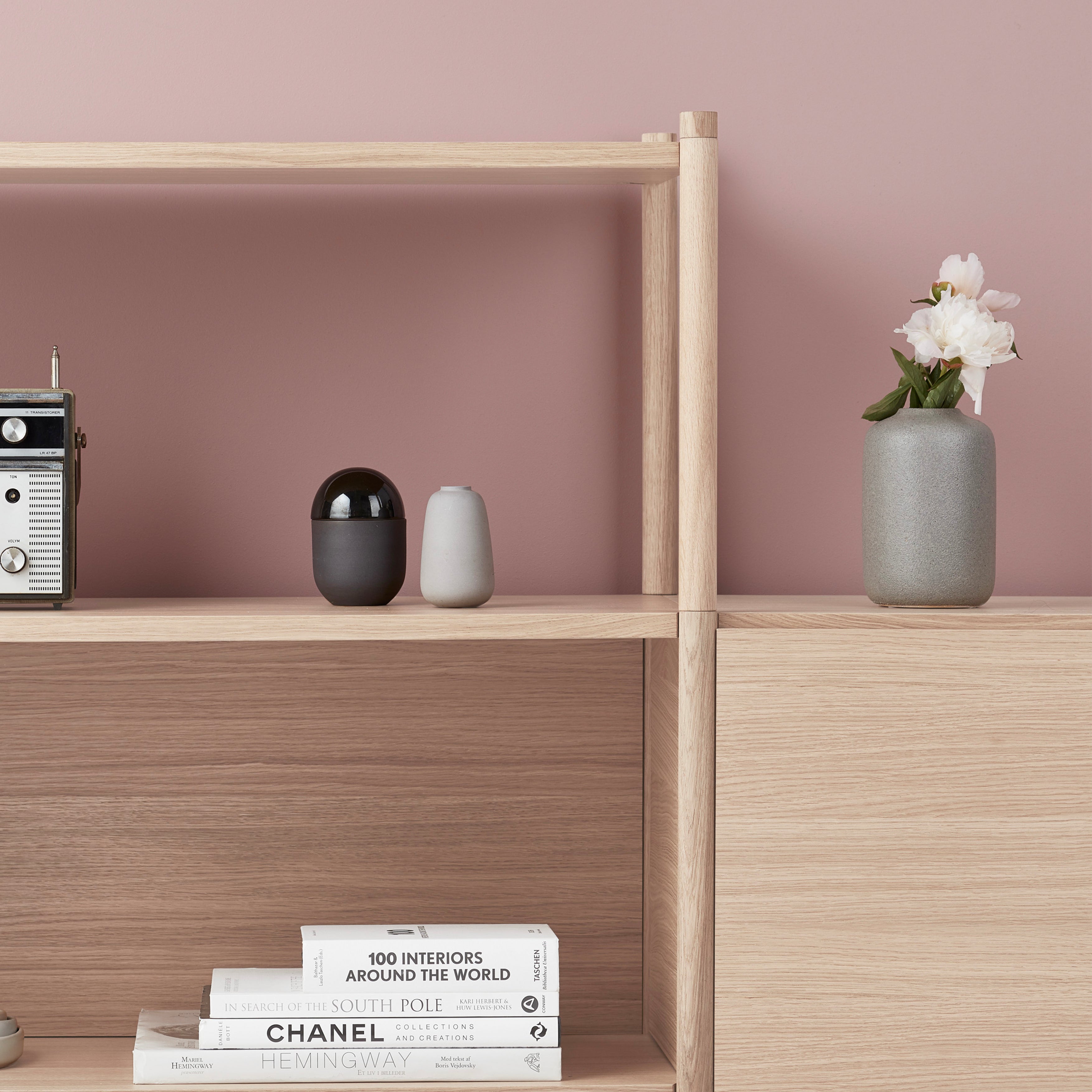 Sceene is a modular shelving system, designed by Michael Rem for Gejst. Module by module the shelving system can be build up high, extended to the sides and be customized with side panels, doors or back panels made in oak or black oak. The idea behind Sceene is to create a frame to put the stories we form during our life on display. Our stories are captured in artifacts and objects full of sentimental value and with Sceene you can tell your stories exactly how you want.