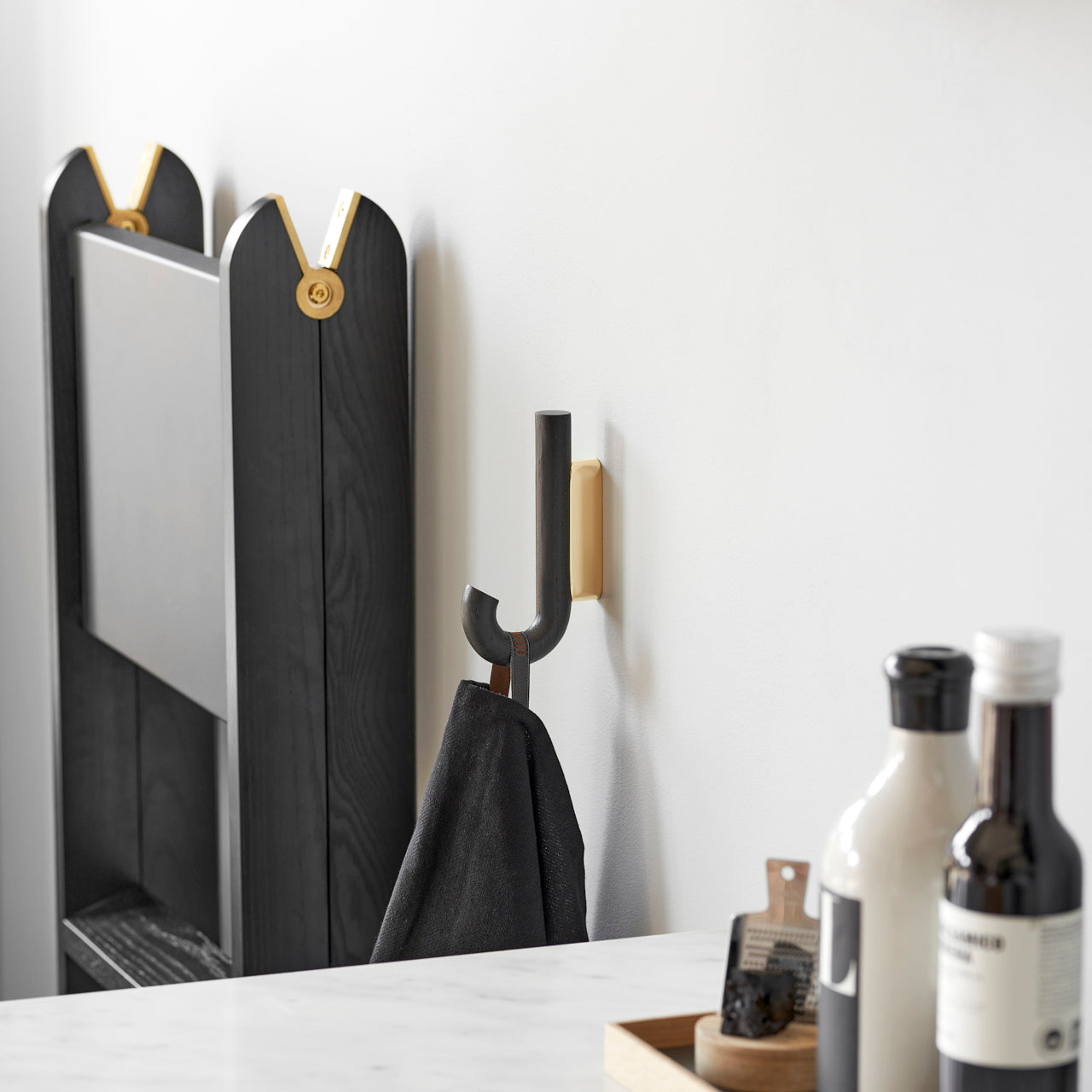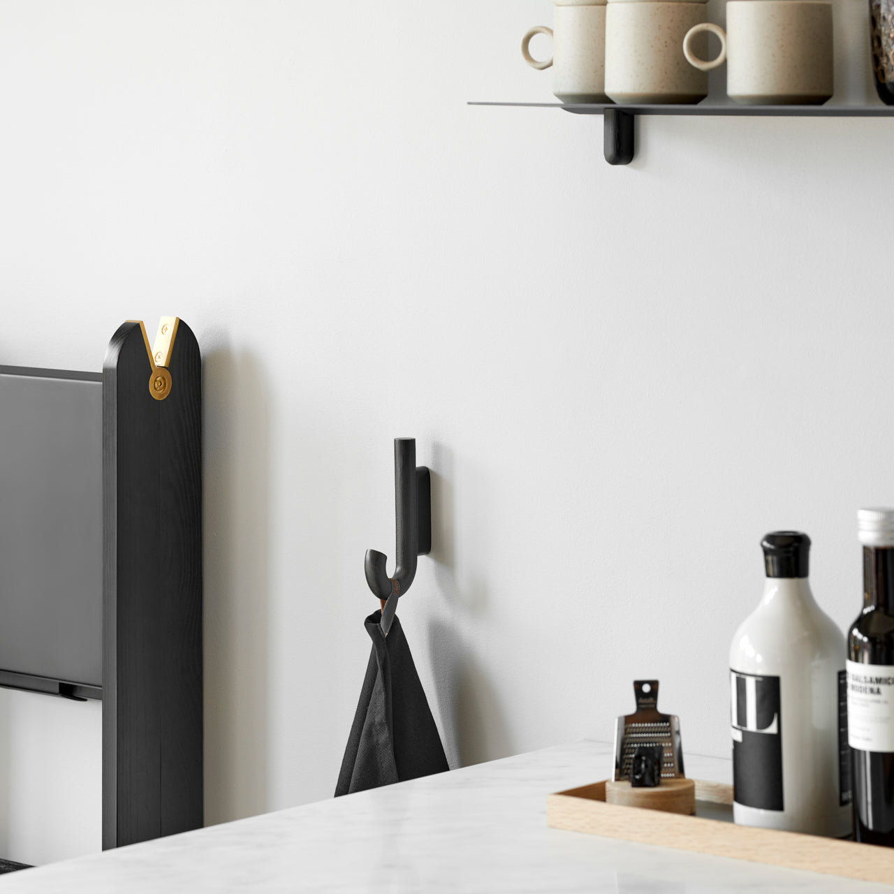 Hook mini is a discreet and beautiful addition to your home interior. The straightforward design invites everyone to hang their jackets, bags, or umbrellas in the hallway. Hook mini can also hold tea towels or aprons in your kitchen or organize towels and bathrobes in your bathroom. The hangers are available in black oak, warm walnut or oak treated with white pigment and matt lacquer, all with beautiful details in wood, while the fittings are available in brass, chrome, and black.