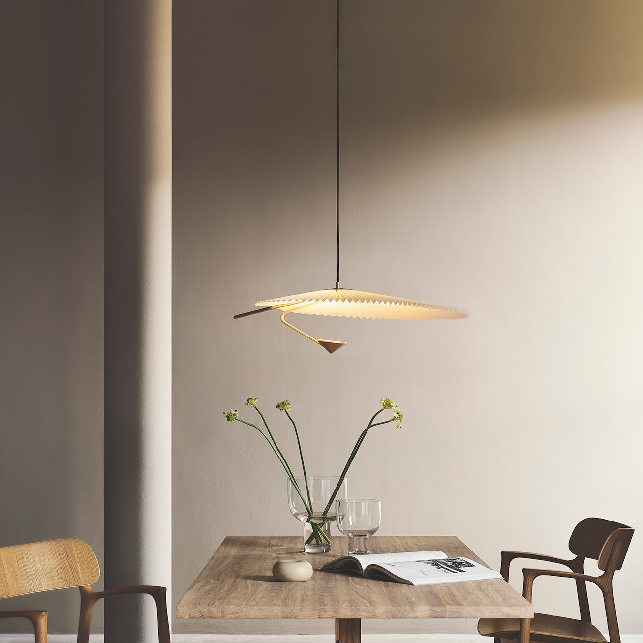 Beginning with a table lamp, the concept evolved into a comprehensive collection featuring pendant, floor, wall, and table lamps. The aim was to blend the playful, handcrafted essence of a fan with a modern industrial foundation. By enhancing light quality through the integration of a small elevated LED light source, they transformed the folded fan into both a lampshade and a reflector. When positioned against a wall, the lamp emits a soft, evenly dispersed ambient glow.