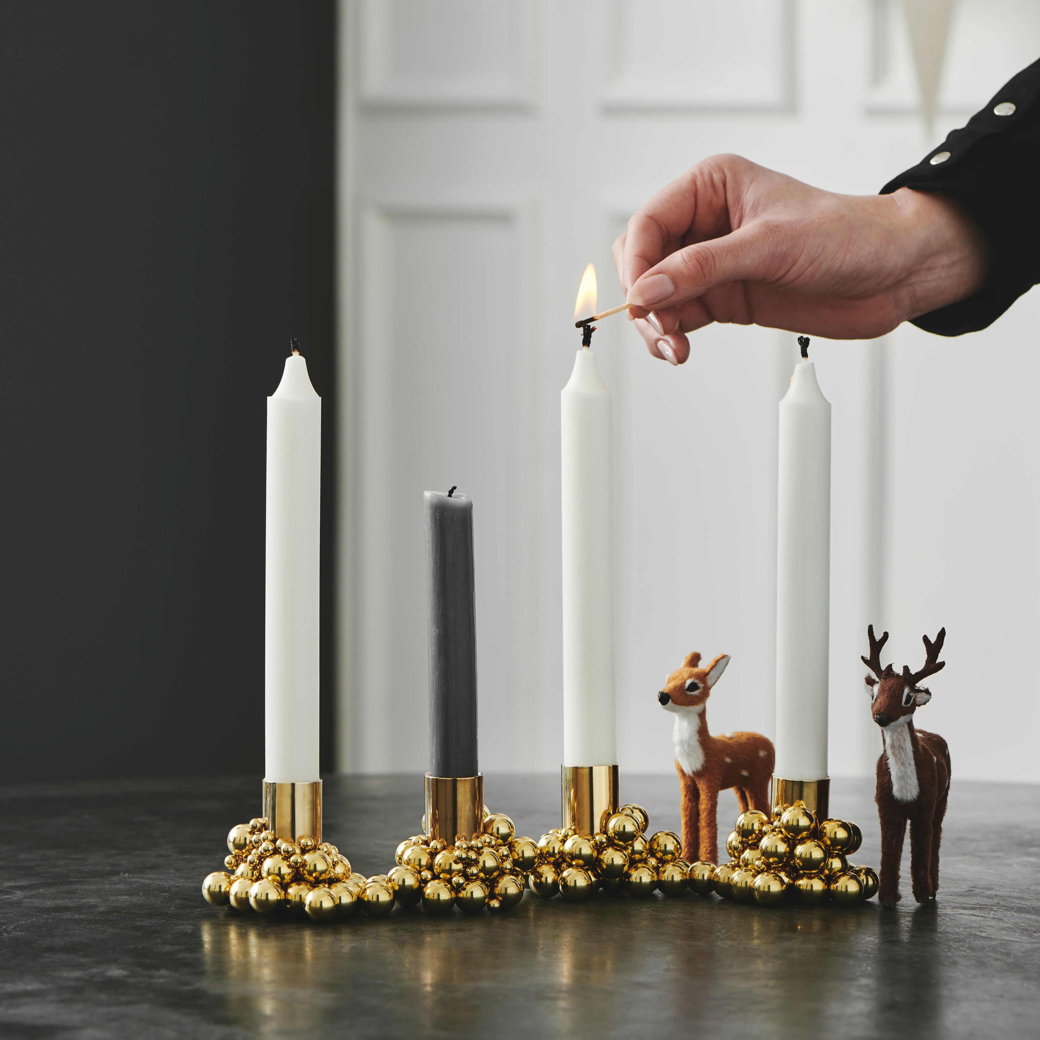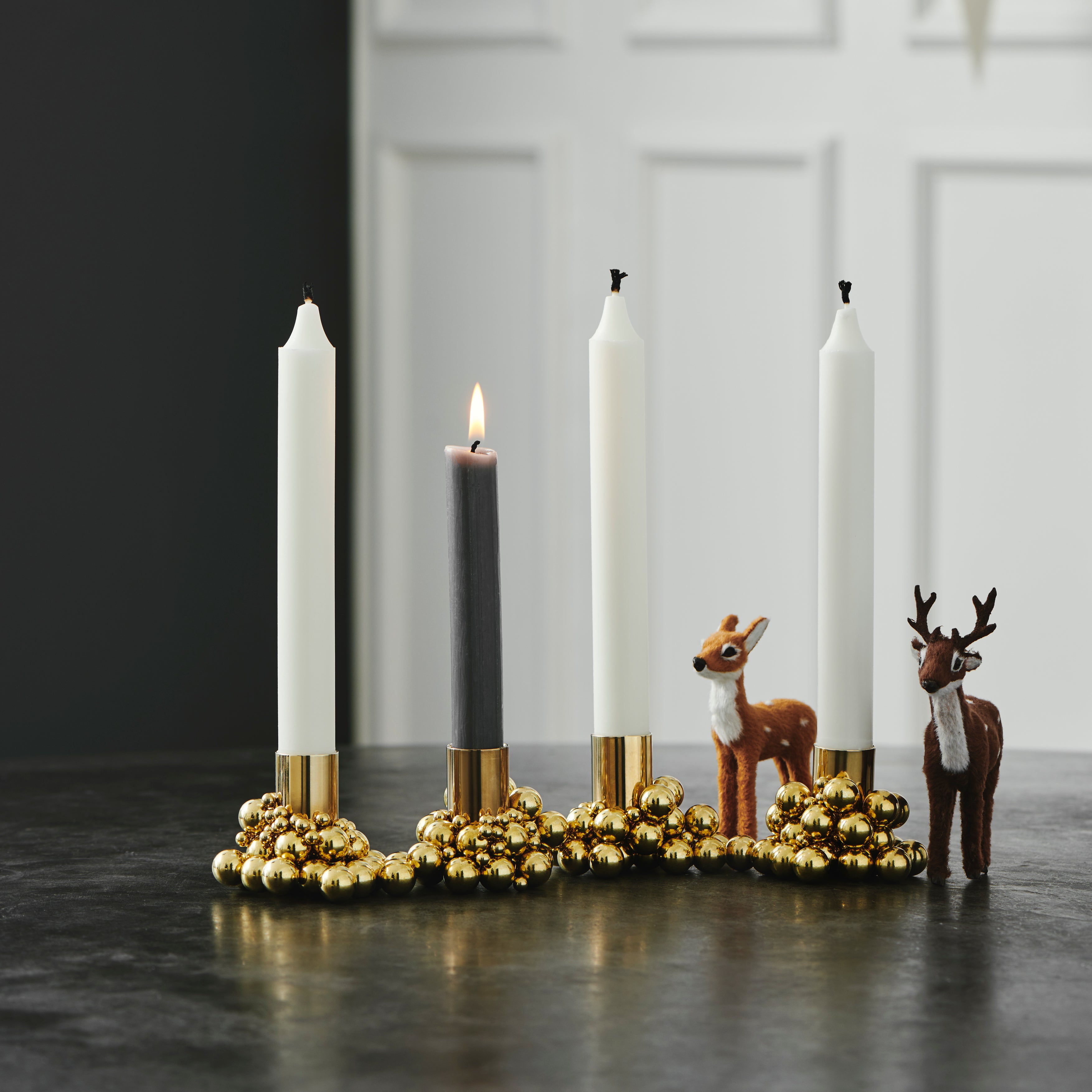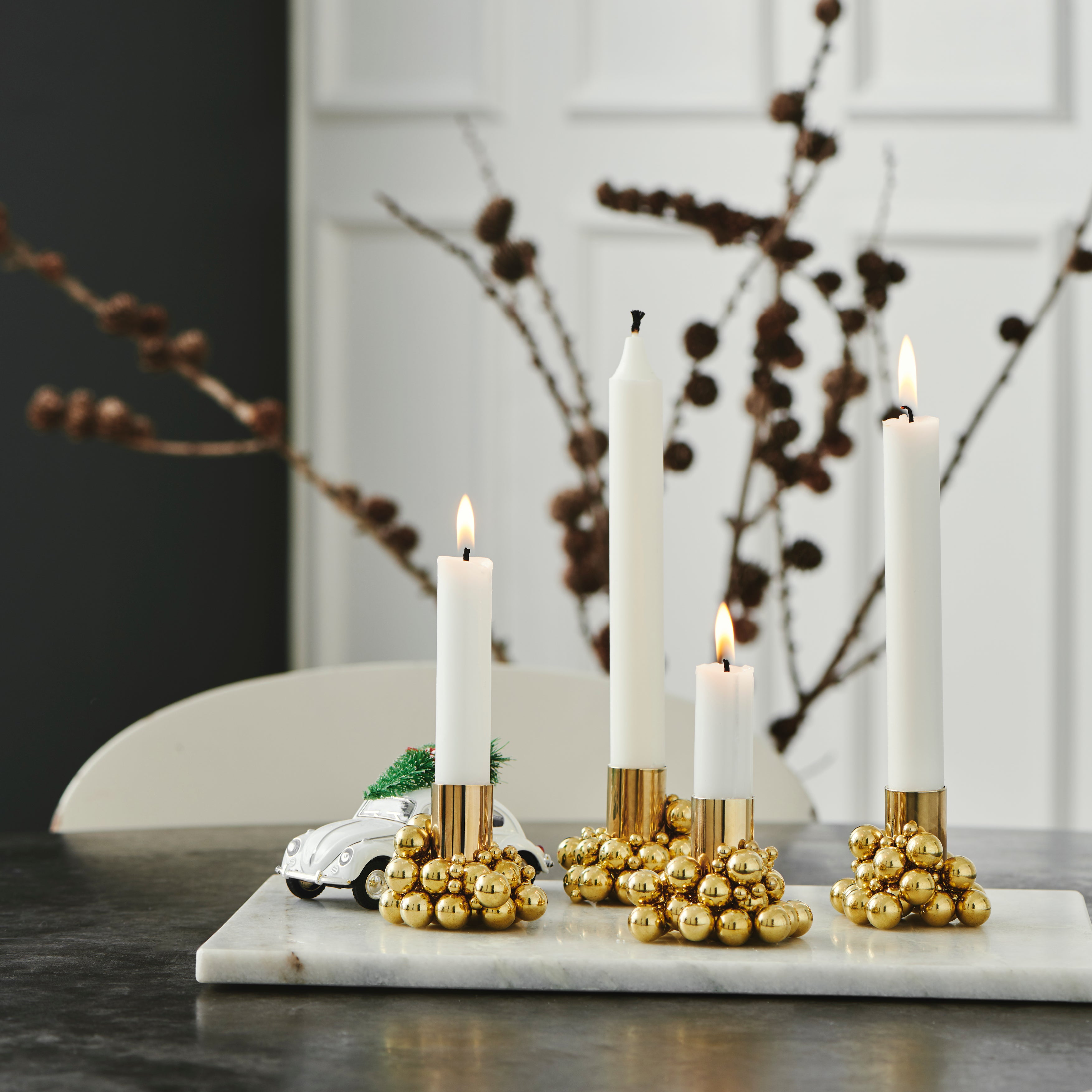 Each candleholder comes with 25 large and 25 small steel balls and a strong magnet. With endless possibilities for arranging the balls and candle pipe as you wish, no two Molekyl candleholders are the same.