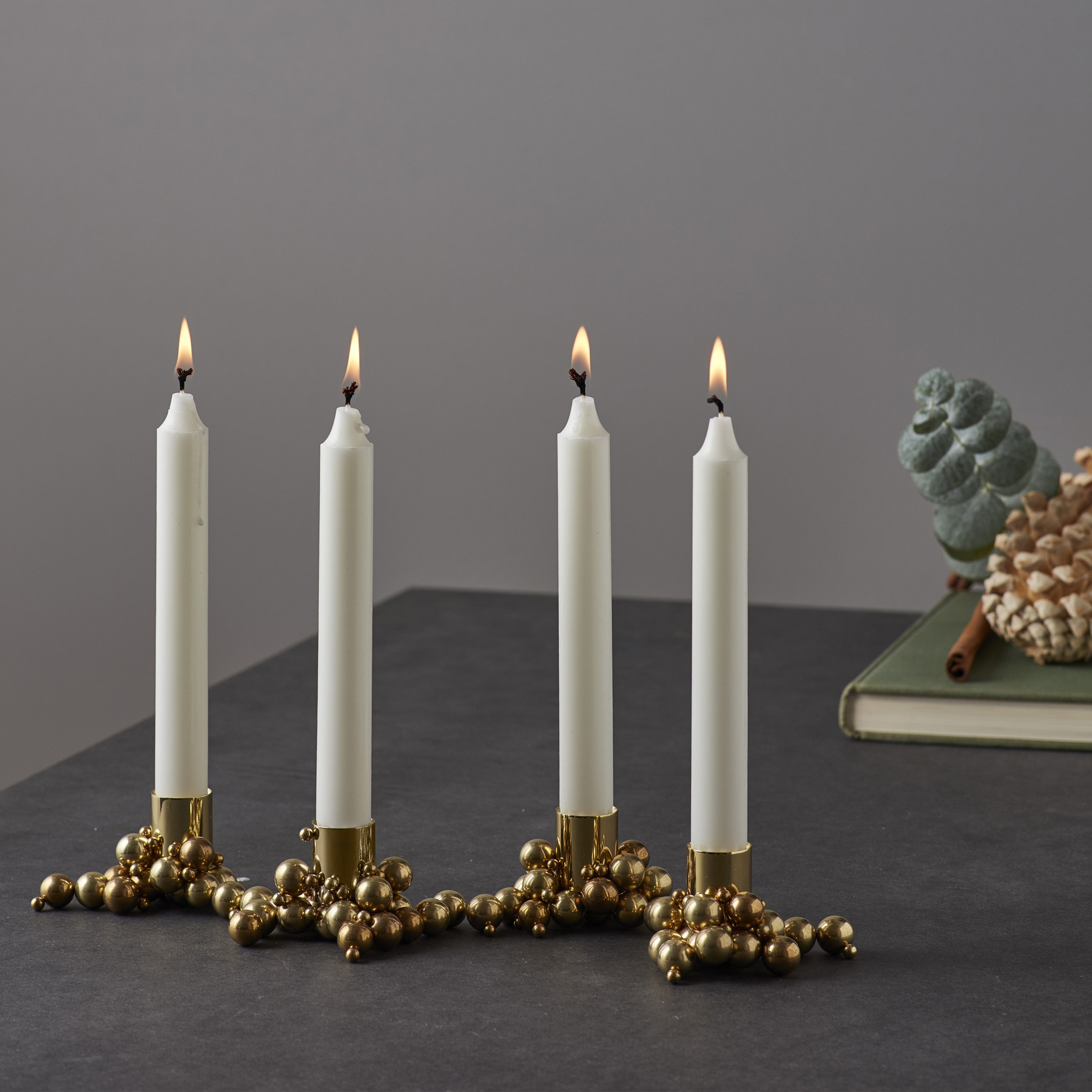 Use the candleholder as a centerpiece on the table or on the windowsill. Combine multiple candleholders to create a traditional Christmas or seasonal display. Or take a more bold approach by placing the candle pipe on top of the balls like it is floating over a cluster of molecules. Place some of the steel balls under a thin table to play with perceptions of space and gravity. Alternatively, create your design using just the large or small balls together.