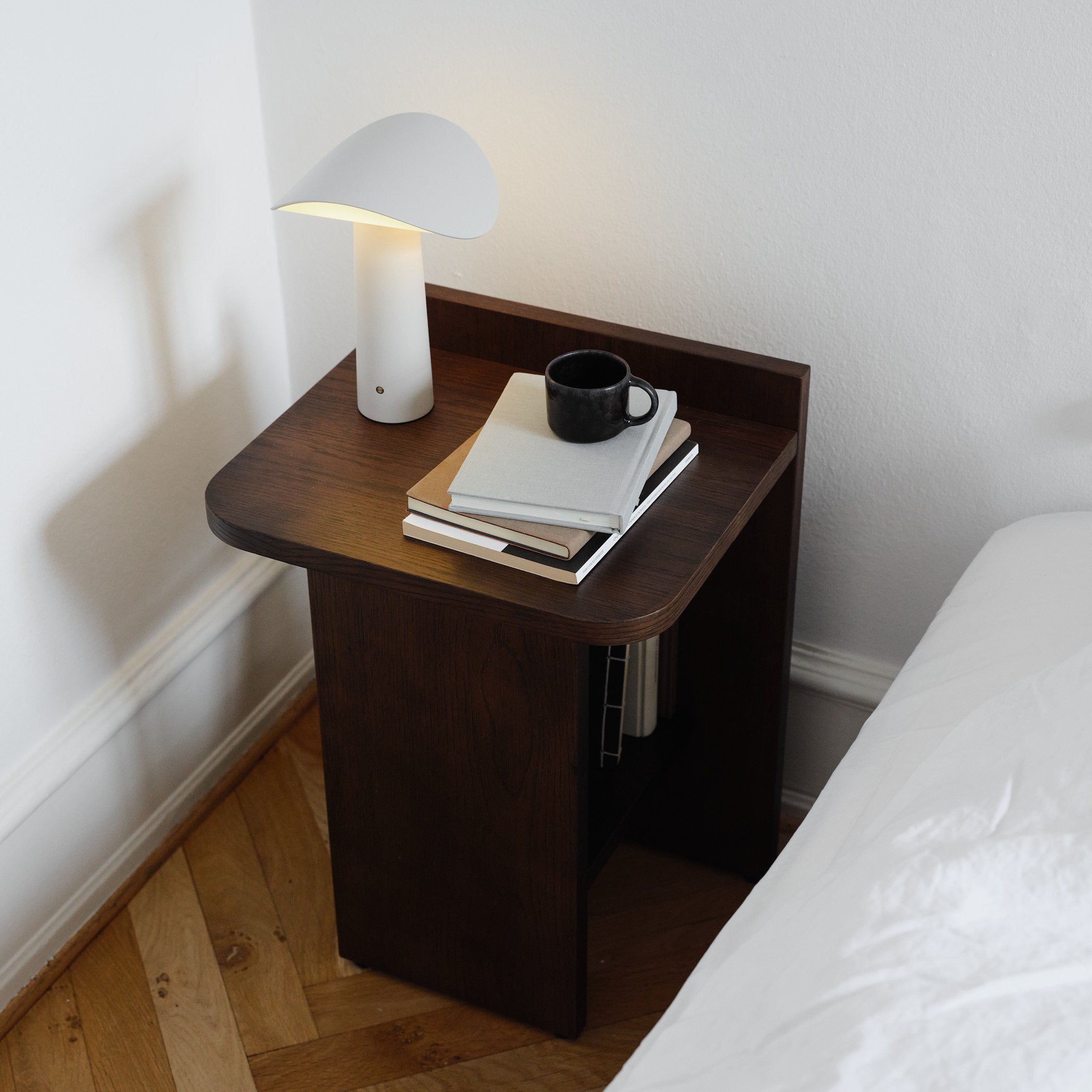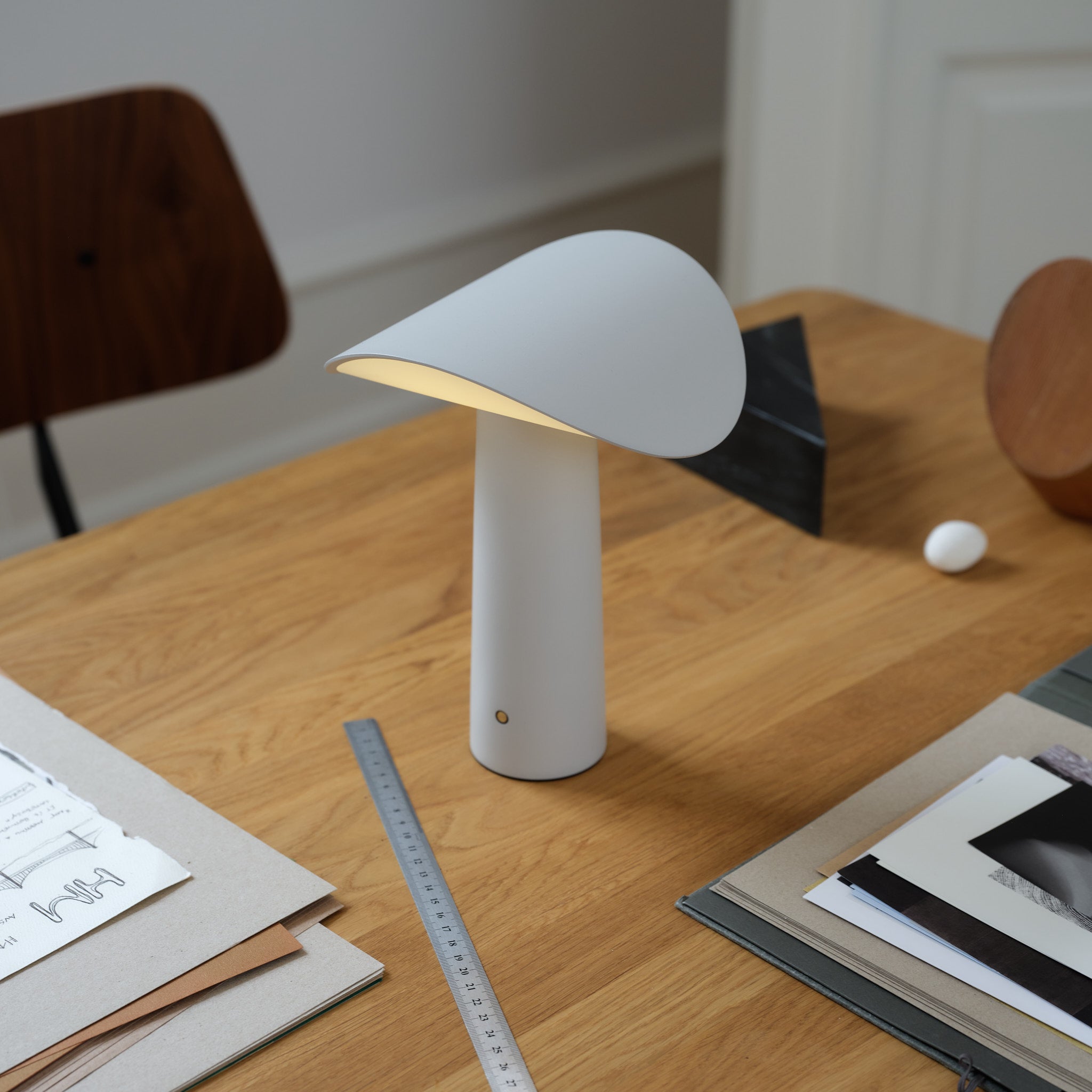 Lium is inspired by the mood of fall. The slightly curved lampshade is reminiscent of autumn leaves that have just fallen in the wind. The leaf rests gently on the lamp body and creates subtle plays of light and shadow that change with the viewer's perspective. The slightly conical base, reminiscent of a tree trunk, reinforces the natural, organic character of the design.