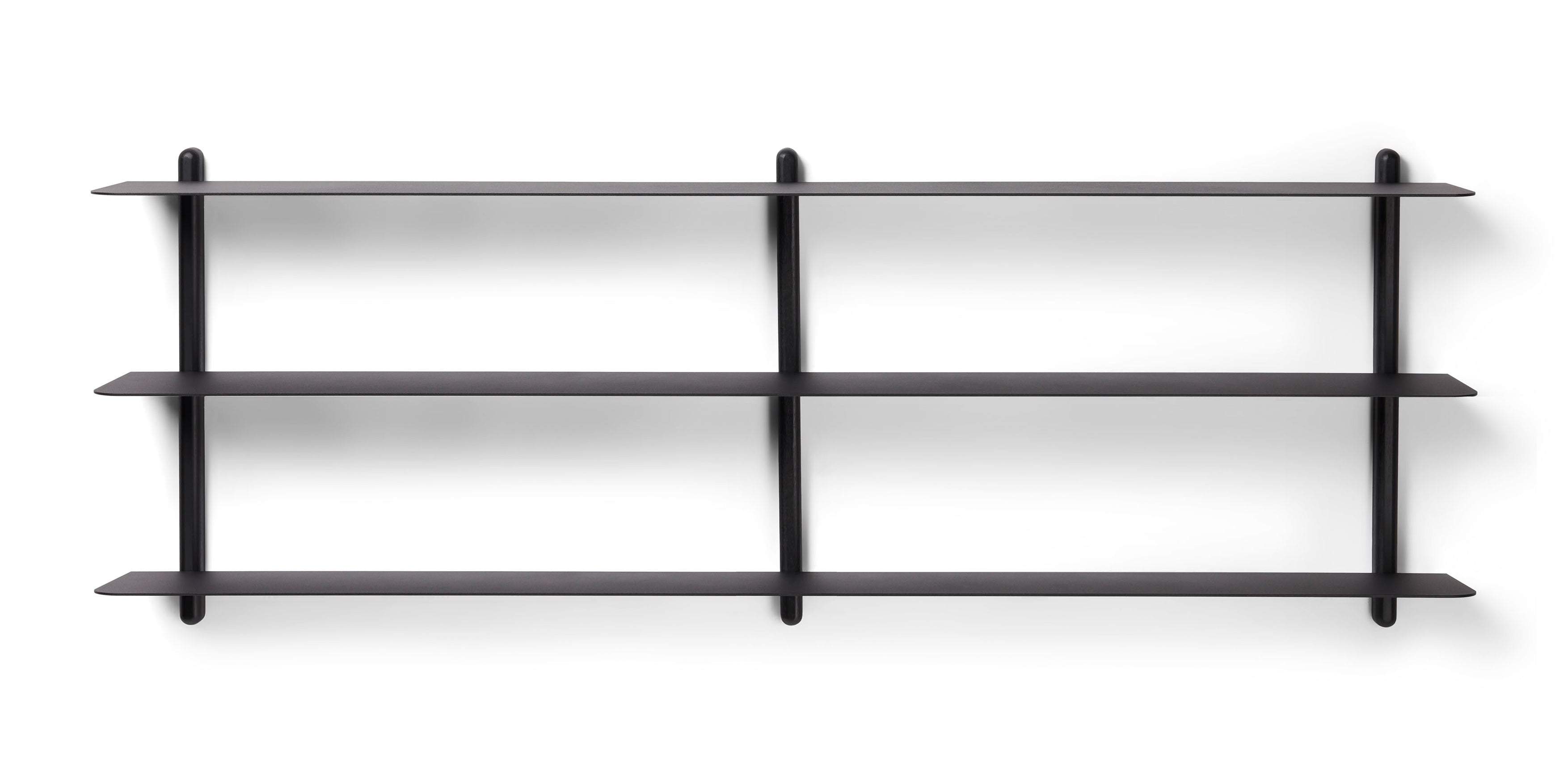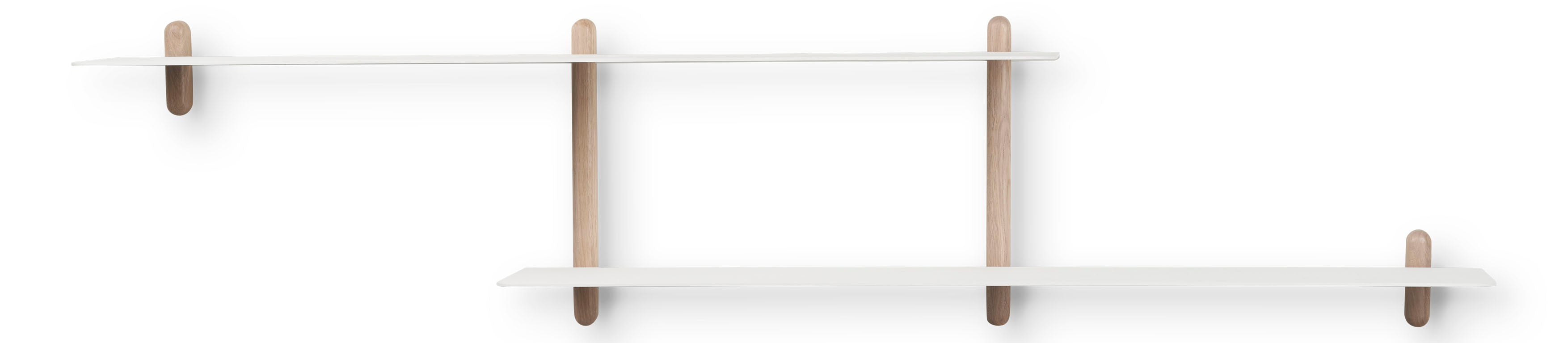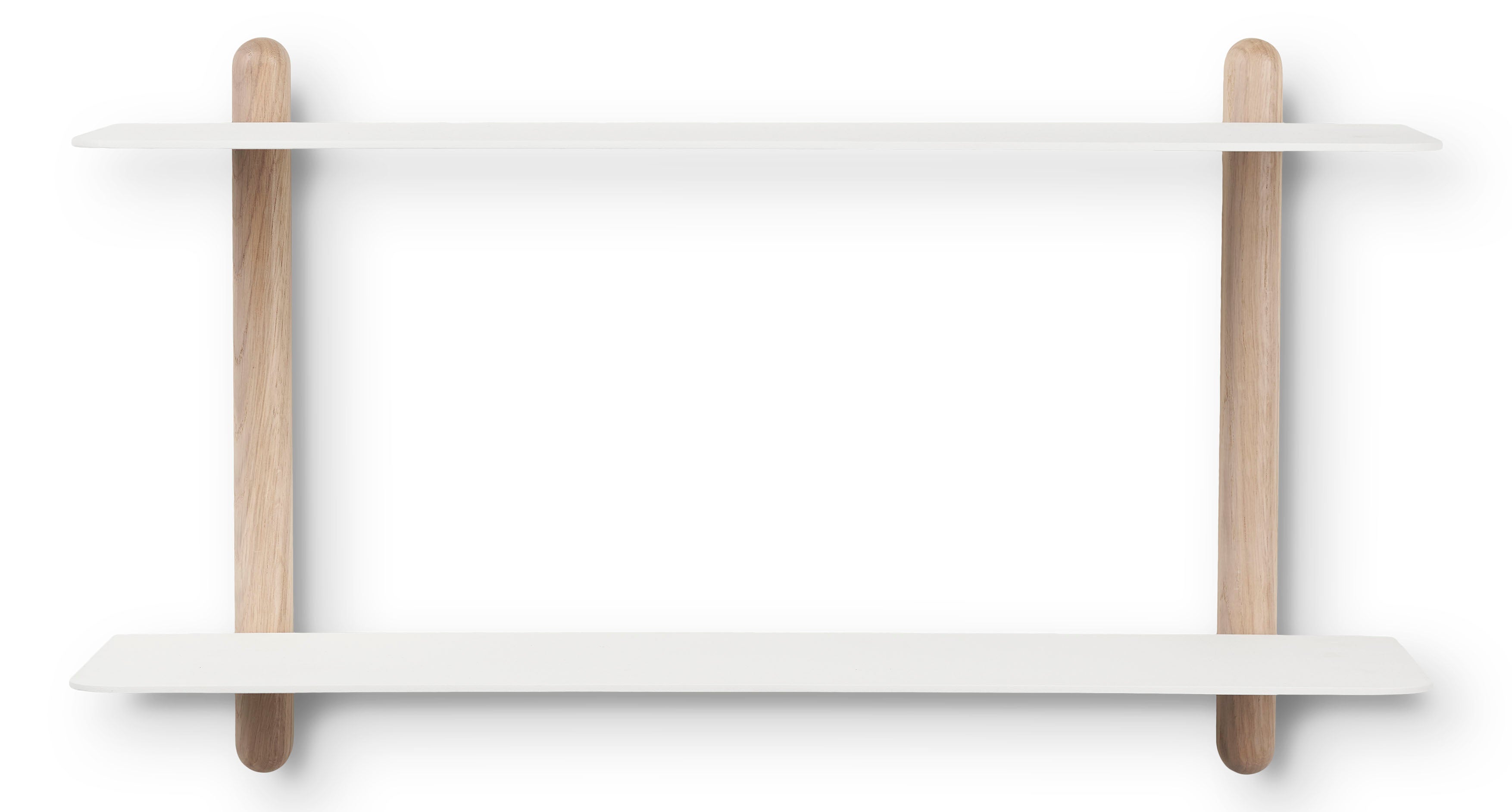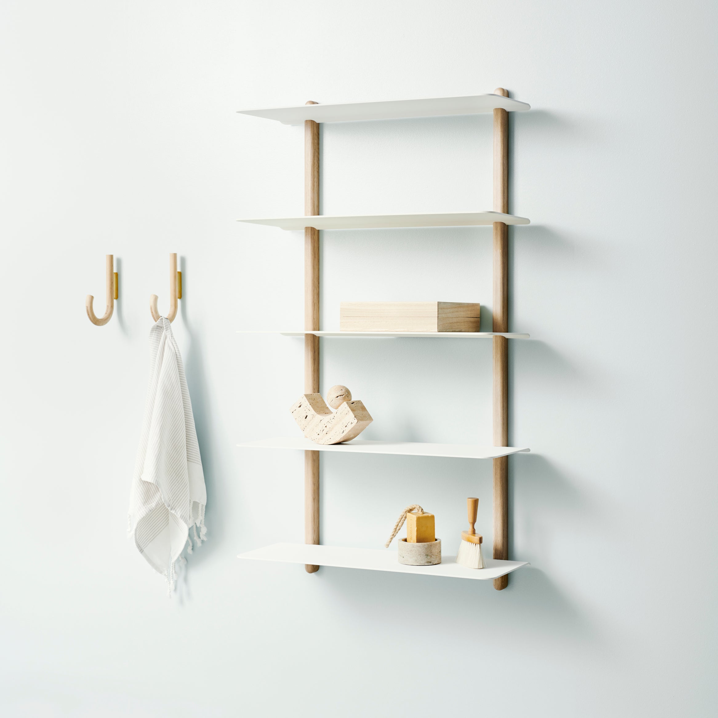Nivo Large is a minimalistic wall shelf designed by Böttcher & Kayser for Gejst. With no unnecessary details and only clean lines Nivo hangs lightly and elegantly on the wall. Every component has been carefully thought out both in terms of design, form and function. There are no visible screws and the shelves are smoothly plugged in to the wooden poles, that have slits made exactly to fit.