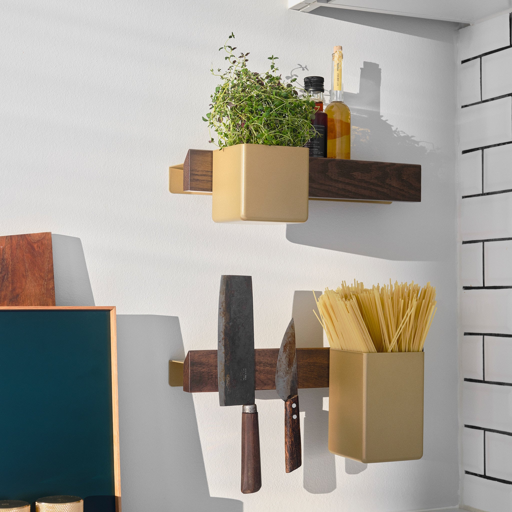 The shelf features a magnetic wooden front, which, in addition to holding accessories, can also be used for knives, keys, scissors, and other metal objects. Designed to free up counter space in the home, Flex is both a functional and stylish solution for kitchens and living spaces alike.